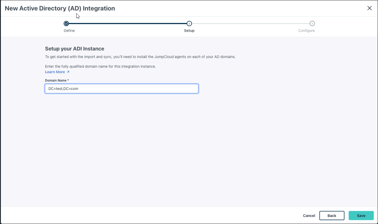 - Enter the name of an Active Directory domain that you want to integrate with your JumpCloud tenant. For example, “DC=example;DC=com”.