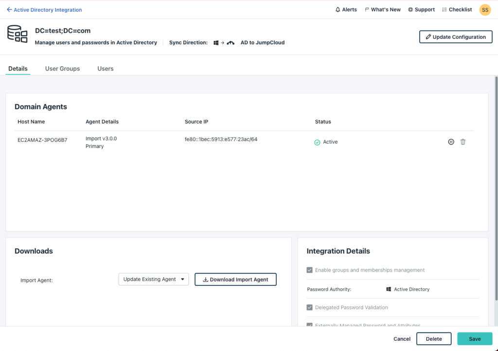 Once you’ve installed and configured AD Import within your environment, you can easily verify that the JumpCloud AD Import Agent is working. Please ensure the following are present and visible: The JumpCloud AD Import Agent should be shown as green and active within the Admin Portal under User Management > Active Directories > Your ADI Instance > Domain Agents section.