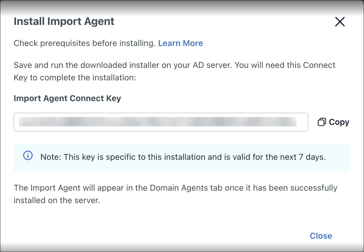 - Click Copy and save the import agent connect key to a password manager for later use.