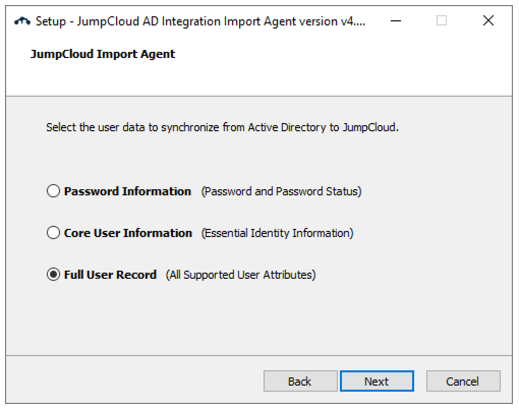 If it is set to Full User Record (AllSupportedAttributes), the attributes that sync from AD to JumpCloud are: