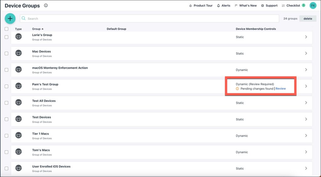 When Require administrator review of updates is selected and membership updates are ready to review, you will see Pending changes found | Review in the Device Membership Controls column of the Device Groups list.