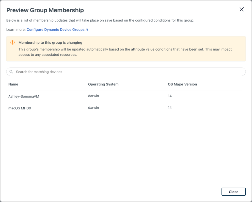 When you have finished configuring attribute-based rules and exemptions for the dynamic device group, click Preview before saving the group configuration to see a list of membership updates that will take place upon save. When you have finished reviewing, click Close, then click save to save the group.