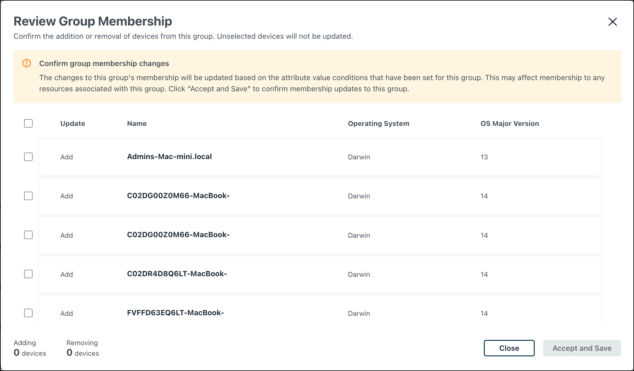 - Click Review Suggestions to open the Review Device Group Membership modal in the Admin Portal.