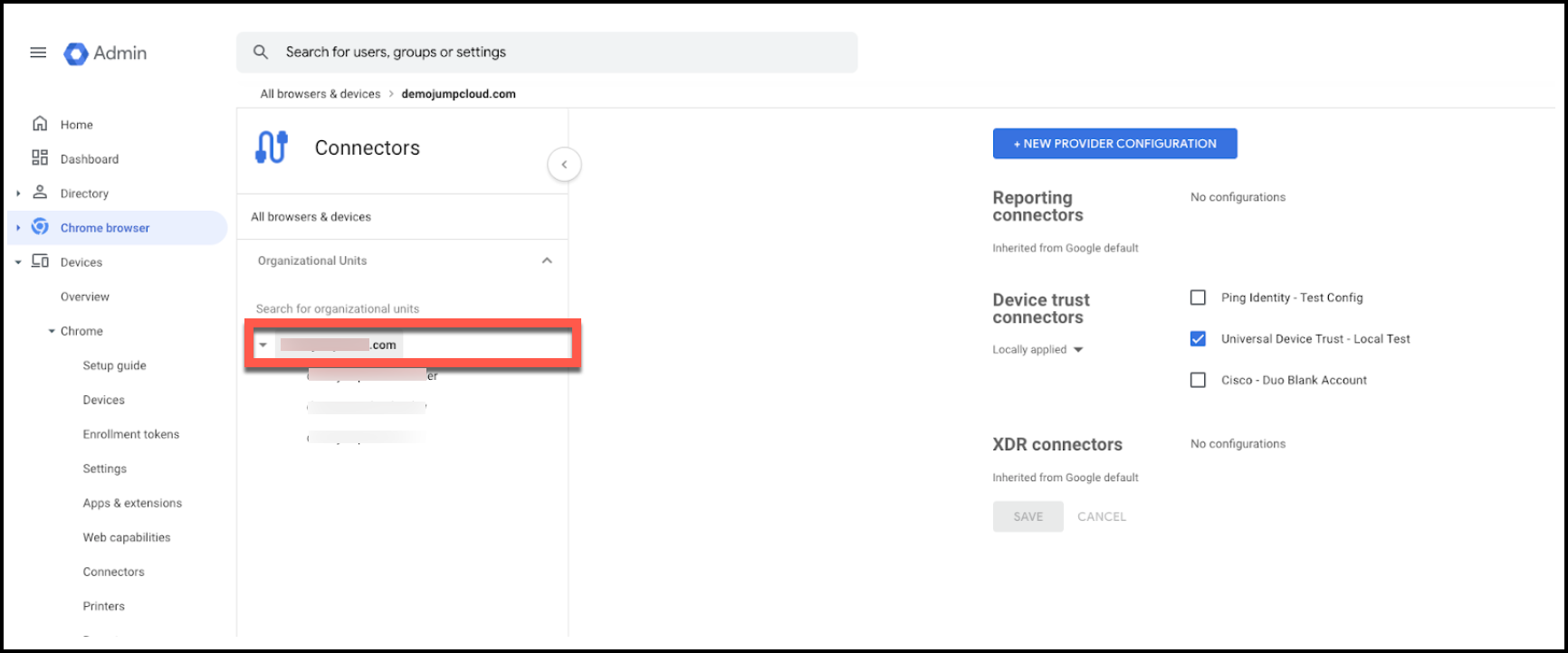 - Go to Devices > Chrome > Connectors and click New provider configuration.