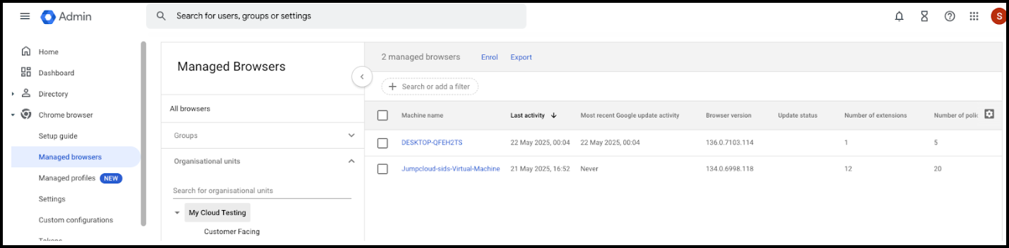 - Devices are listed, along with browser information if Enable Chrome Browser Management Reported was selected in the previous configuration.