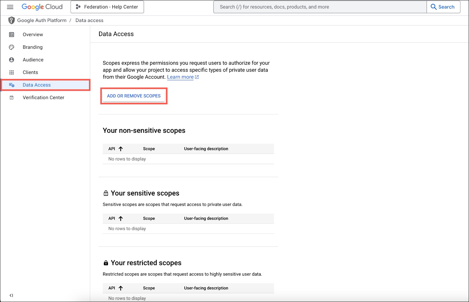 - In the left menu, go to Data Access to manage the scopes. Click ADD OR REMOVE SCOPES.