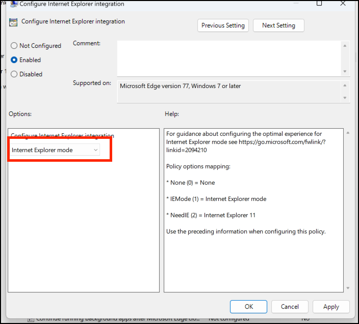 - Under Options, select Internet Explorer mode.