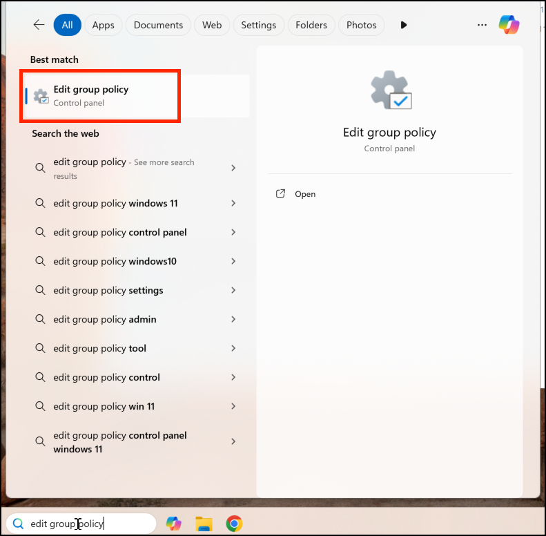 - Click Start and in the search bar type edit group policy to run Group Policy Editor.