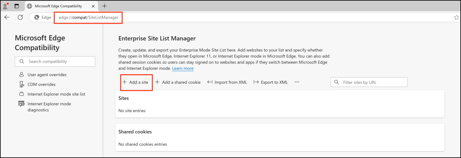 - Run the Edge browser and in the menu bar enter:Â edge://compat/SiteListManager.Â