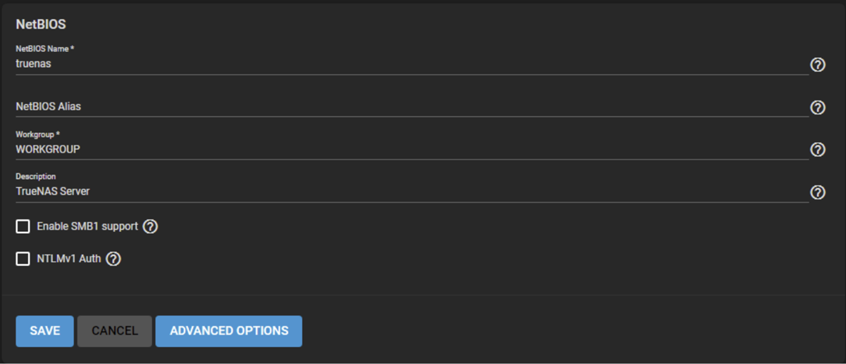 - The NetBIOS Name defaults to truenas and is the only required setting.