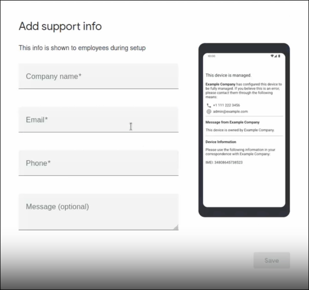 - On the Add support info screen, enter your organization's information that will be displayed to your end users during their zero-touch enrollment, and click Save.