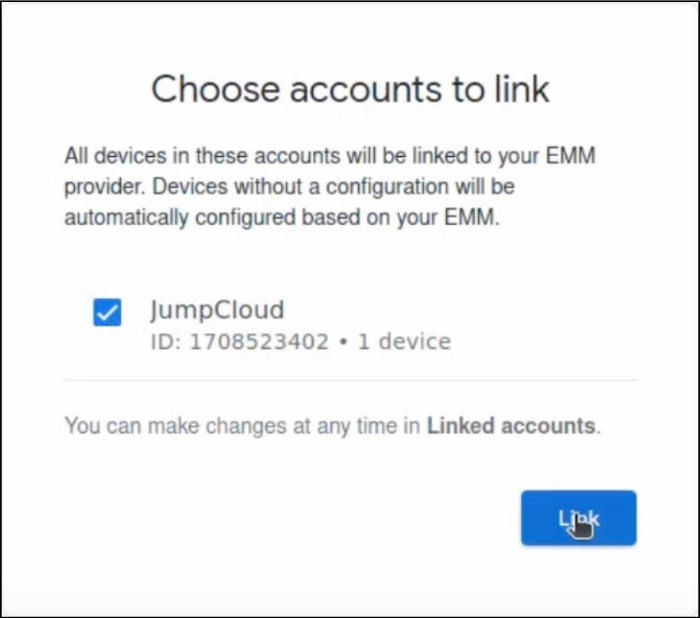 - Under Choose accounts to link, you should see a list of zero-touch accounts. Select the account you want to link to JumpCloud Android EMM and click Link. Note: A zero-touch account can only be linked to one EMM tenant at a time.
