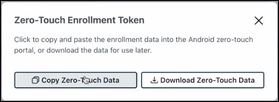 - Click Copy Zero-Touch Data. Alternatively, click Download Zero-Touch Data to save the data to your device. A success message appears. Continue with the steps below to configure the Android zero-touch portal with your zero-touch enrollment data.