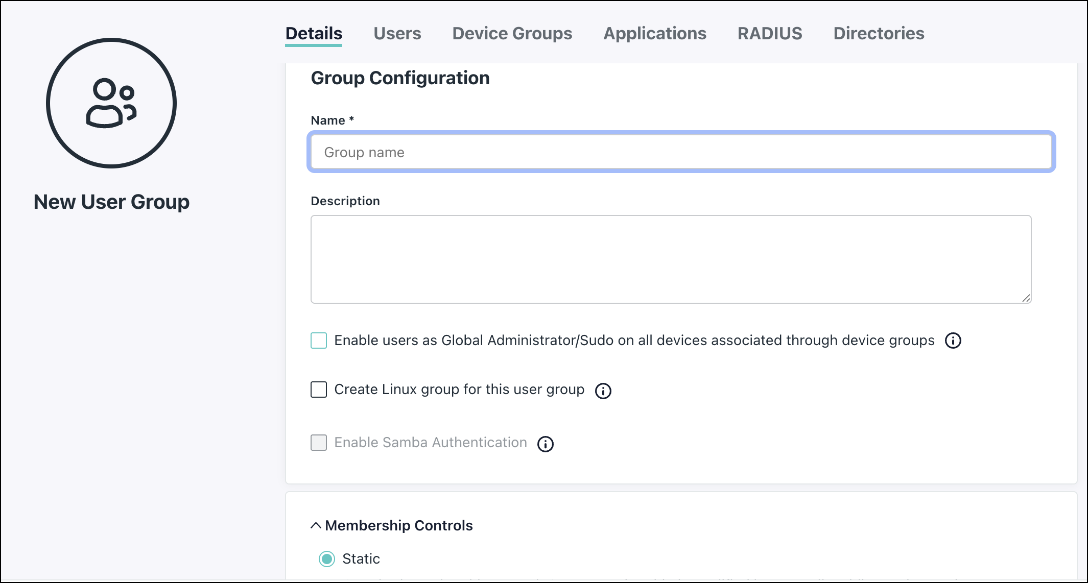 JumpCloud groups are created as Static User Groups by default, meaning their membership must be managed and updated manually. Static user groups are best for situations when the membership is primarily unchanging, and the membership in the group cannot be formed using an easily-defined criteria.