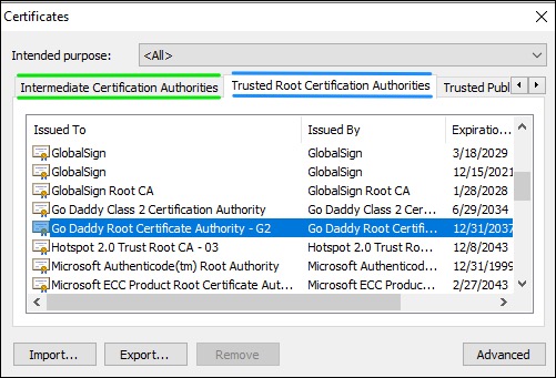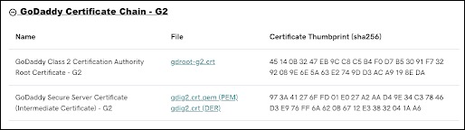 The certificates are signed by GoDaddy. Depending on the LDAP client configuration requirements, the GoDaddy Root CA and Intermediate CA certificates may need to be saved to the local Trusted Root Certificate store. Both of these certificates can be obtained from the GoDaddy website repository.