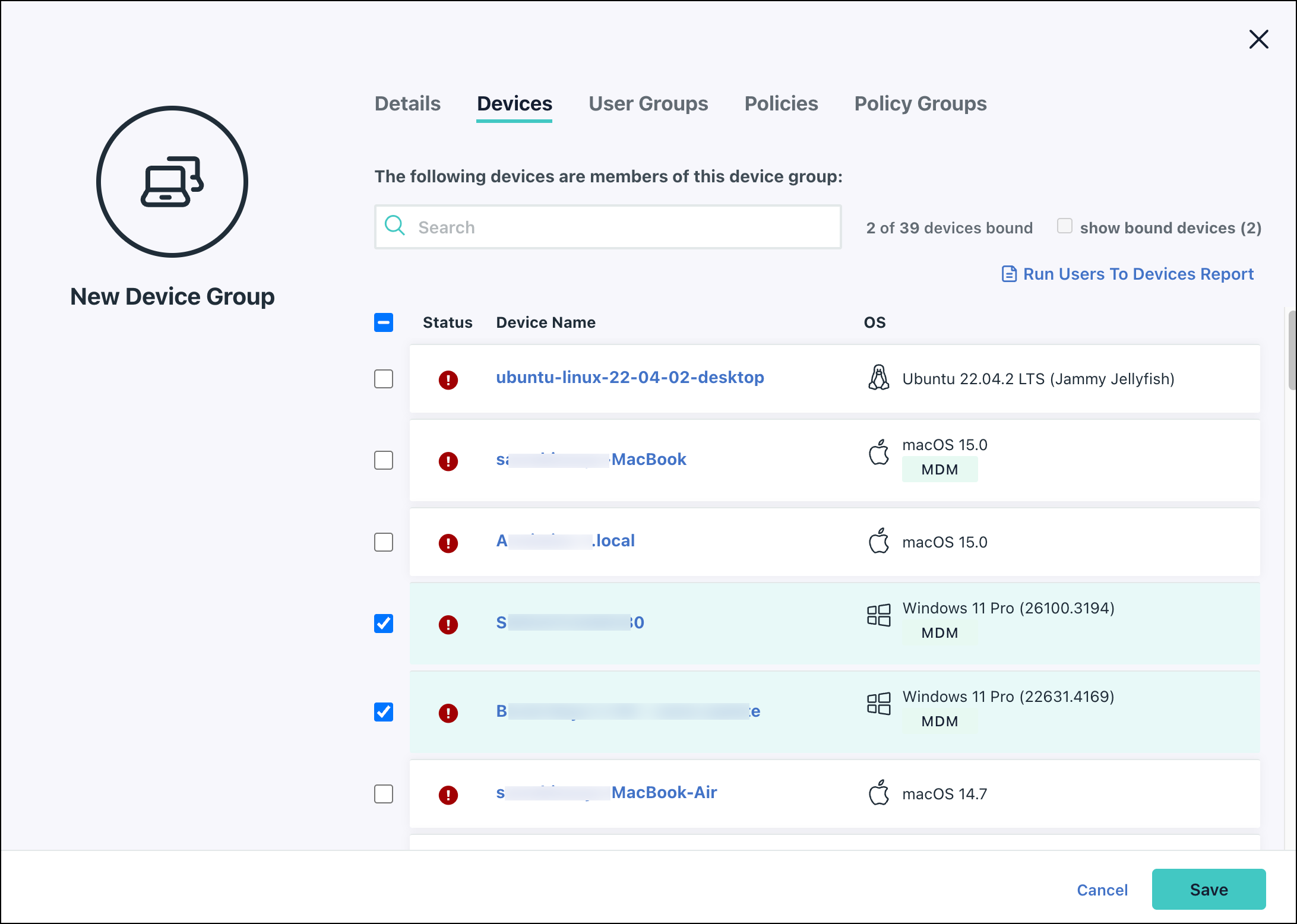 - Select the checkbox next to each device that will belong to this group.