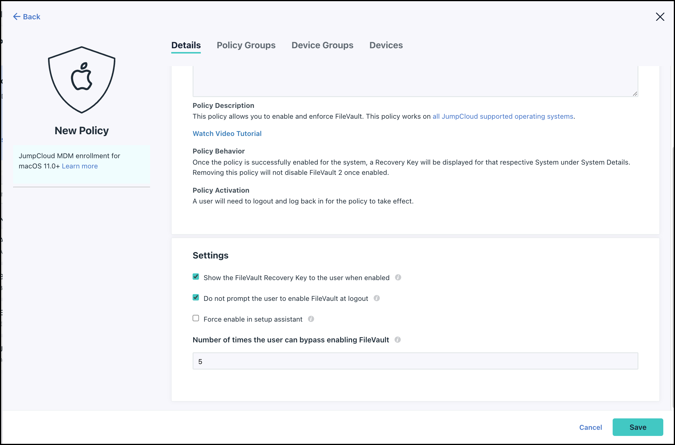 At this point, FileVault is now completely enabled on the devices where you applied this policy. You can view the Recovery Key for the device, and users can't disable FileVault.