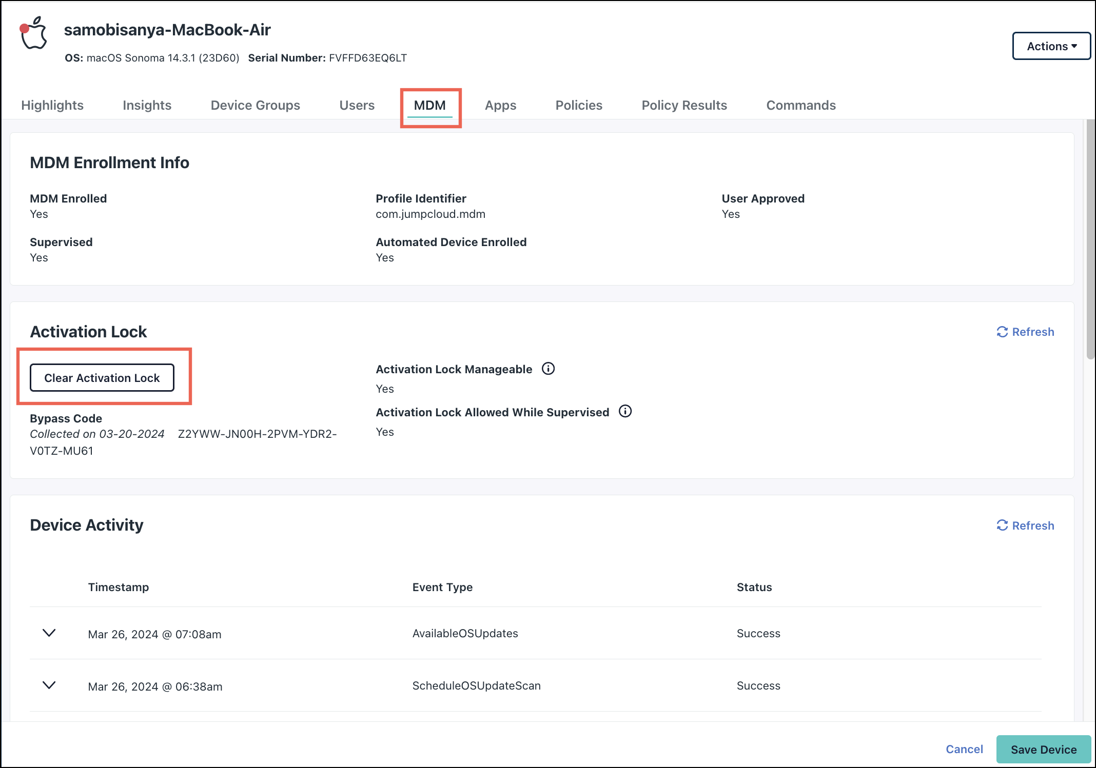 - Under Activation Lock Allowed While Supervised, yes indicates that JumpCloud is applying the Activation Lock policy to allow Activation Lock for the device.