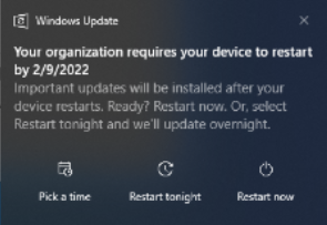 The alerts for updates using the JumpCloud Patch Management policies are delivered to users via the default system notifications on Windows. This aligns with Microsoft's recommendations and leverages Windows Updates’ built-in intelligence for prompting users and scheduling restarts.