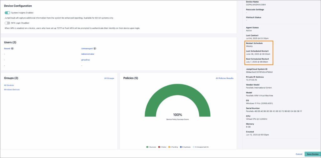 After you assign a device or group of devices to this policy, you can view the scheduled restart details by navigating to Device Management > Devices and selecting the target device from the list. The Highlights tab displays the following: