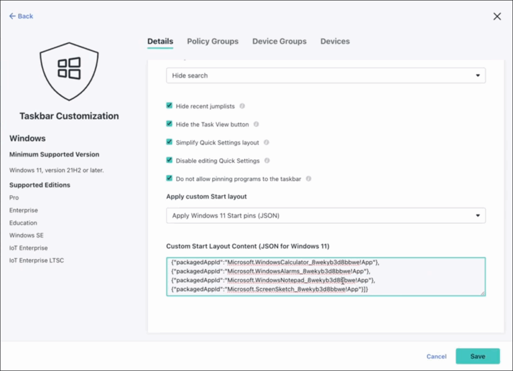 - Upload the final, modified JSON file to the Apply custom Start layout policy setting to apply your changes to managed devices.