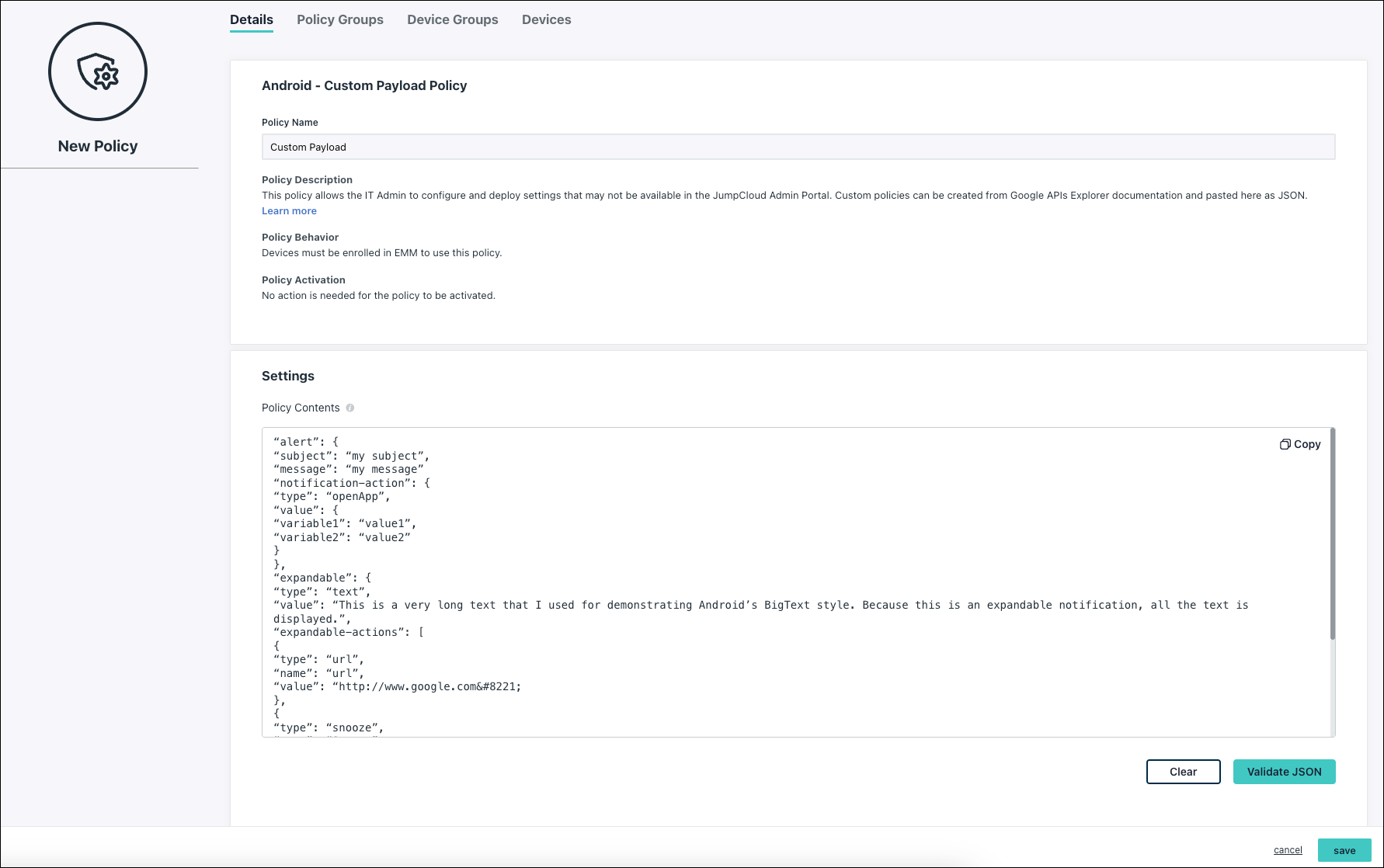 You can specify top-level policy fields to control the behavior of a managed device and the apps installed on it. The Custom Payload Policy lets IT Admins provide JSON content to quickly create a custom policy. You can even combine multiple JumpCloud policies into a single policy in the form of a JSON file. This policy works for devices running Android 5.1 and later.