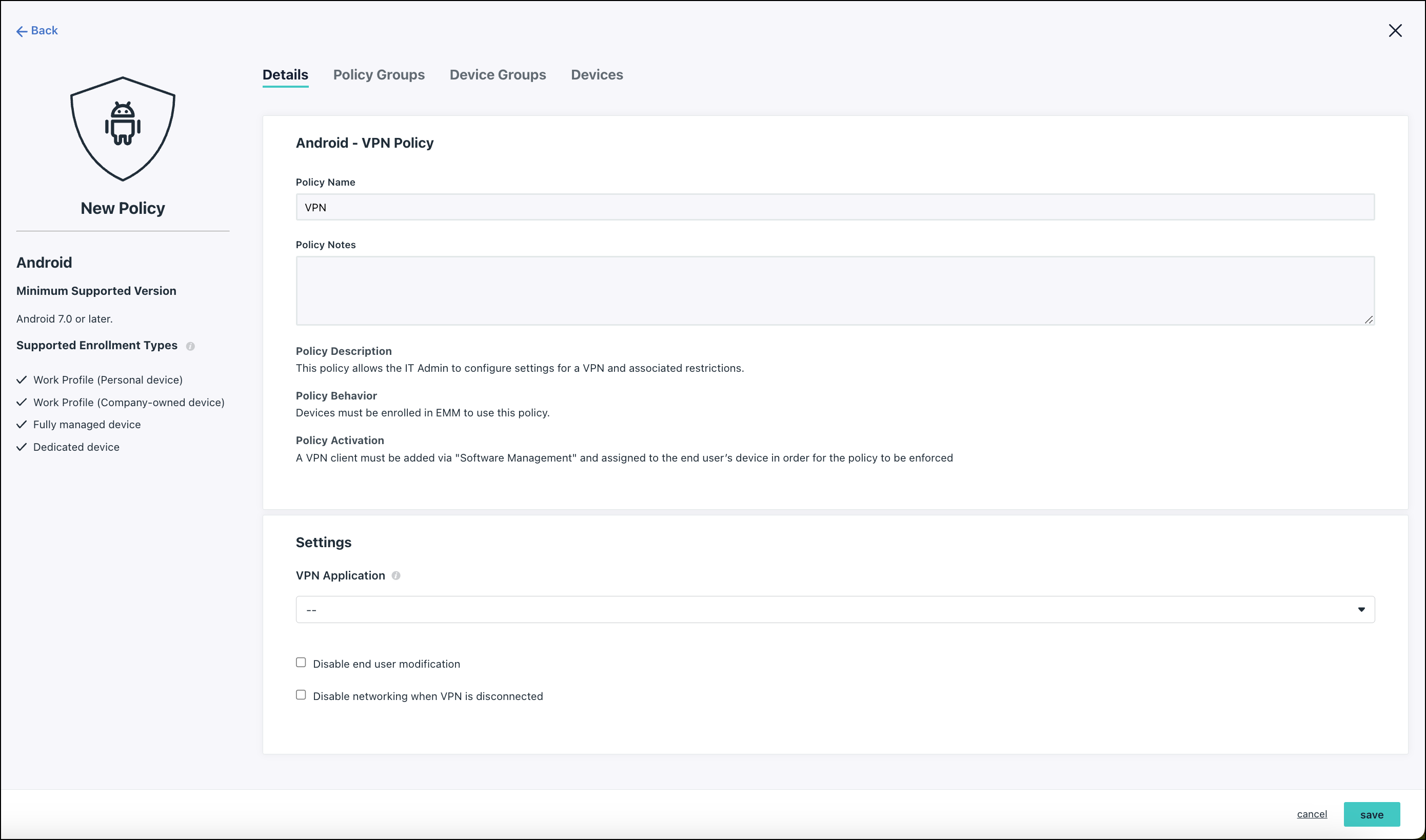 To create an Android VPN policy: