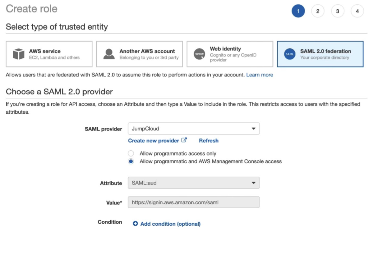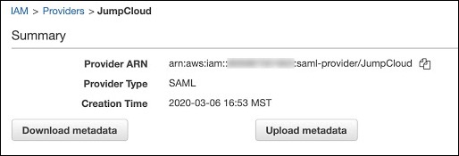 When you configure AWS roles in JumpCloud, you need to create federated roles in AWS and collect the provider Amazon Resource Name (ARN) and the role ARNs.