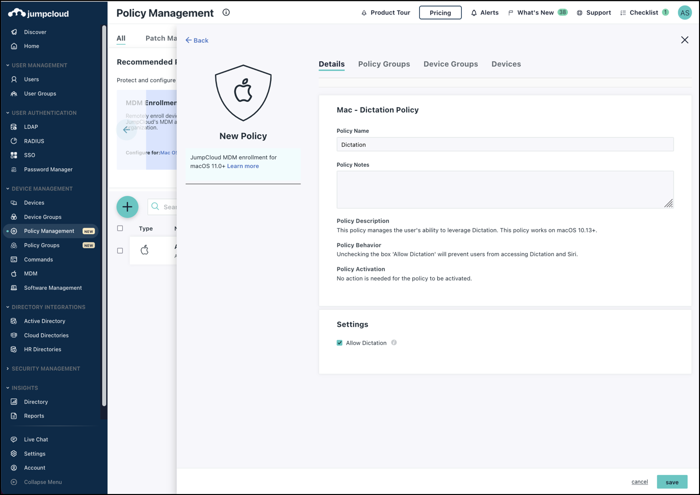 This policy manages the user's access to Dictation, a voice-to-text tool that lets you speak to dictate text of any length without a timeout. When you use Dictation, information like your voice input and contact names are sent to Apple to help your Mac understand you better. This policy works on all JumpCloud-supported macOS devices.