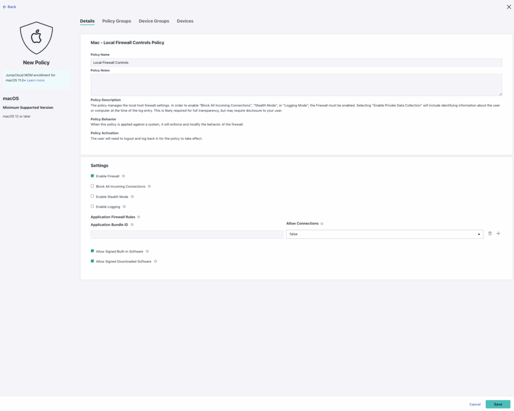 The Local Firewall Control Policy for macOS helps you enforce and modify the behavior of a local firewall. A firewall protects your devices against malicious or unnecessary network traffic.