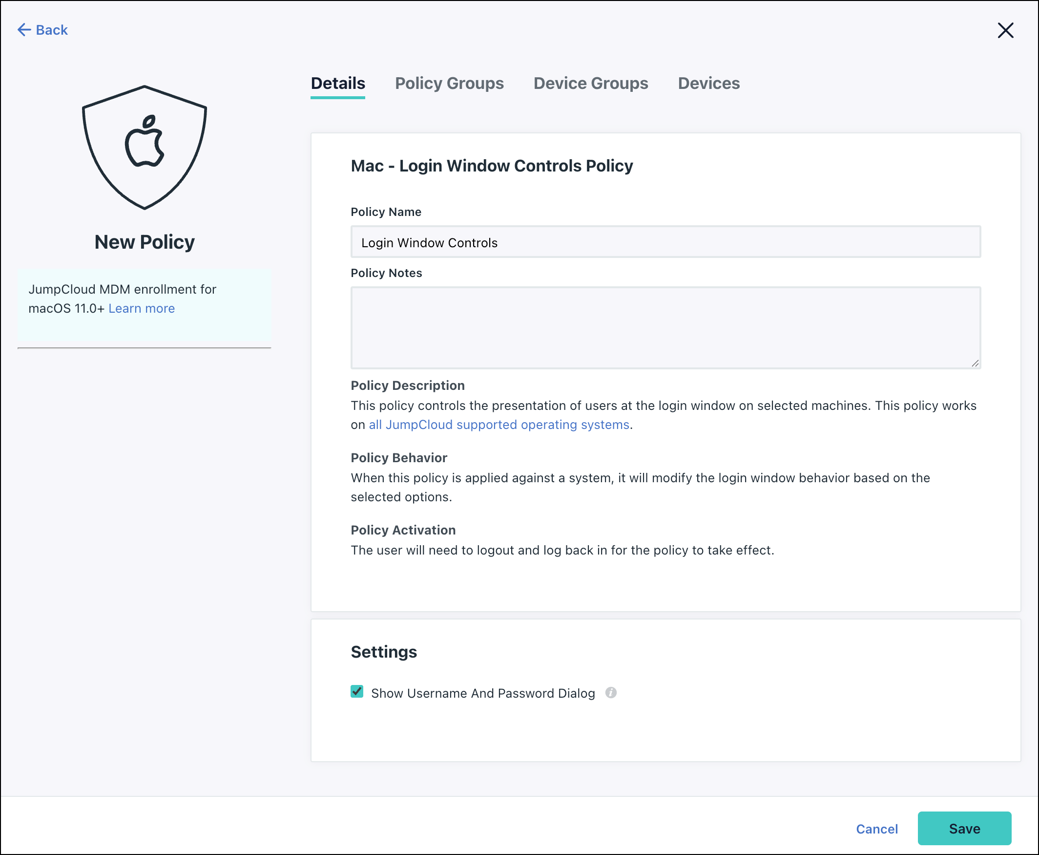 To create a Login Window Controls Policy for Mac: