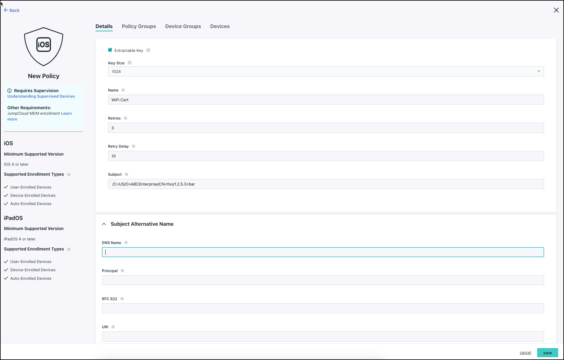 The macOS policy works on all JumpCloud macOS supported operating systems that are enrolled in Mobile Device Management (MDM). The iOS policy works on all JumpCloud iOS and iPadOS supported operating systems on devices that are enrolled in MDM.
