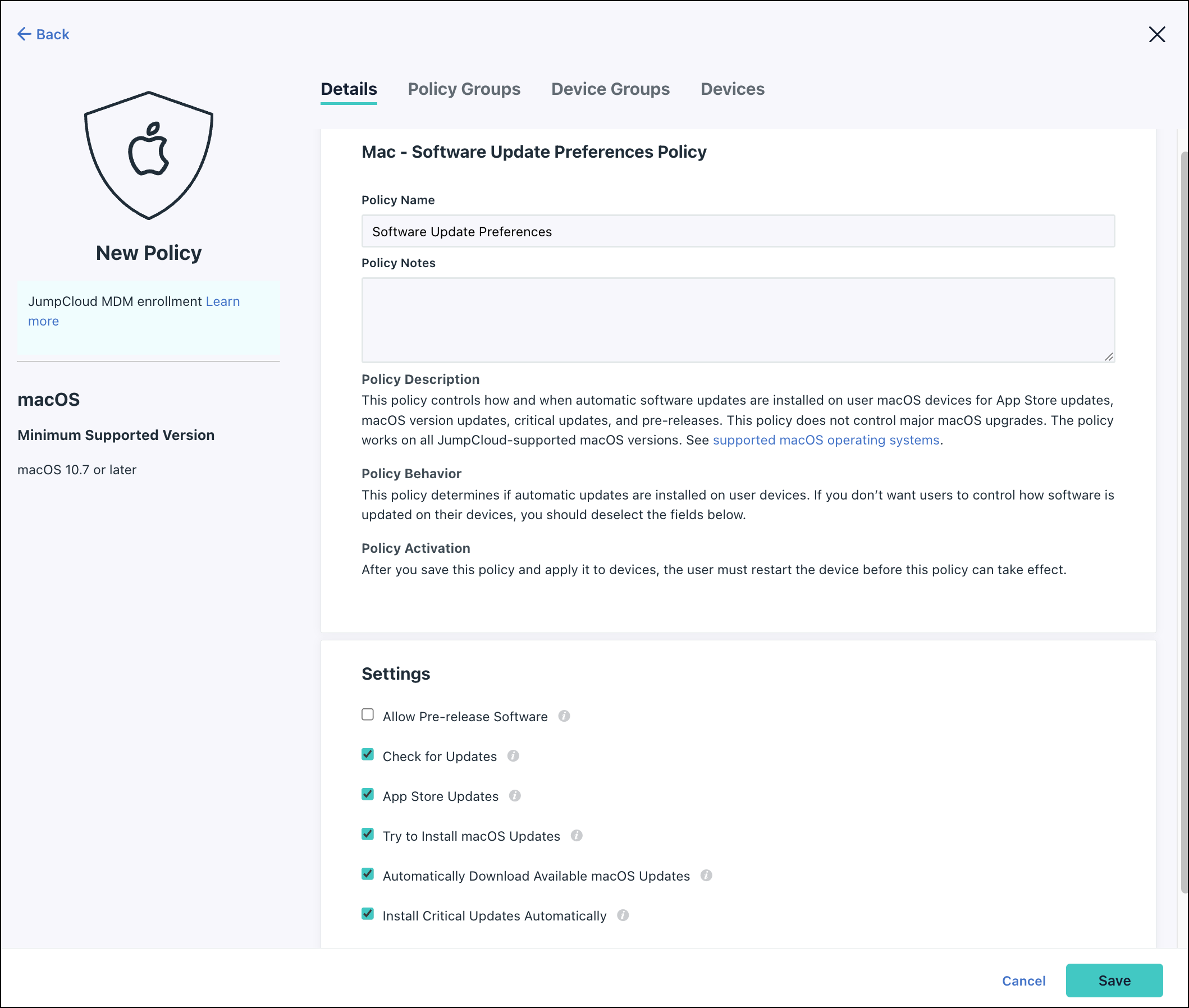 - The settings in this policy are separate from JumpCloud Patch policies. If you want to automatically install updates without user interaction, this can only be achieved with Patch Management.