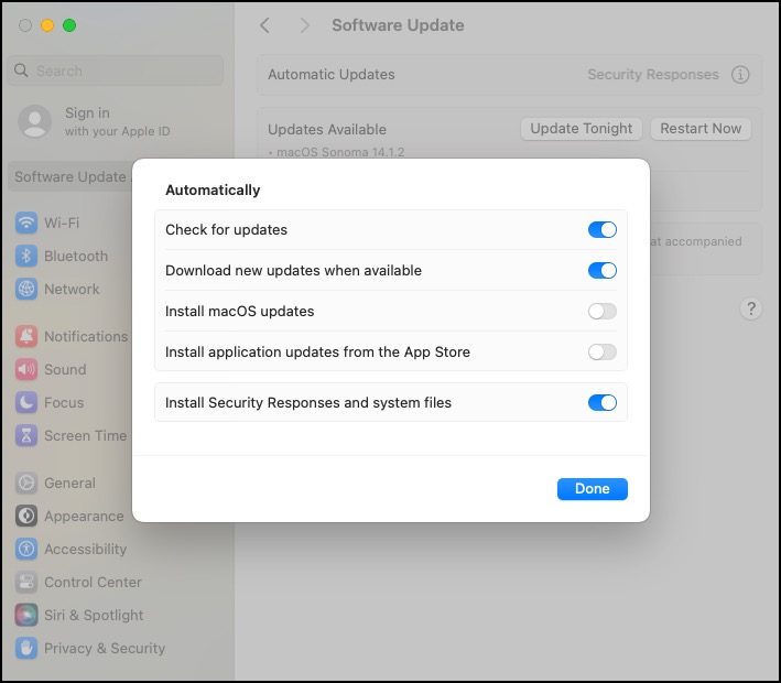 - Select Critical Updates to automatically install critical macOS updates, including system data files and security updates.
