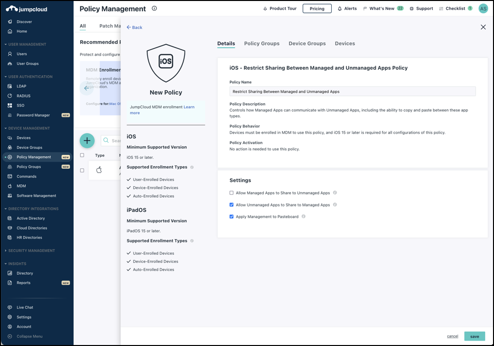 - Select Apply Management to Pasteboard to allow the Pasteboard in iOS to share between managed and unmanaged apps. This feature is enabled by default.