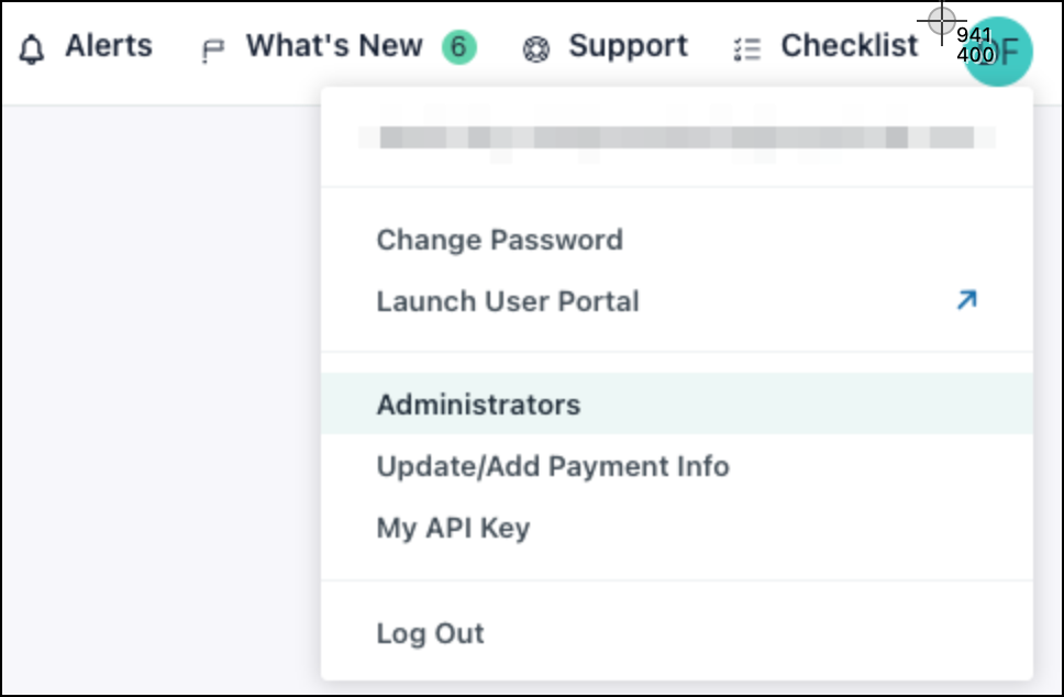 - Click your initials in the top right, and then select Administrators.
