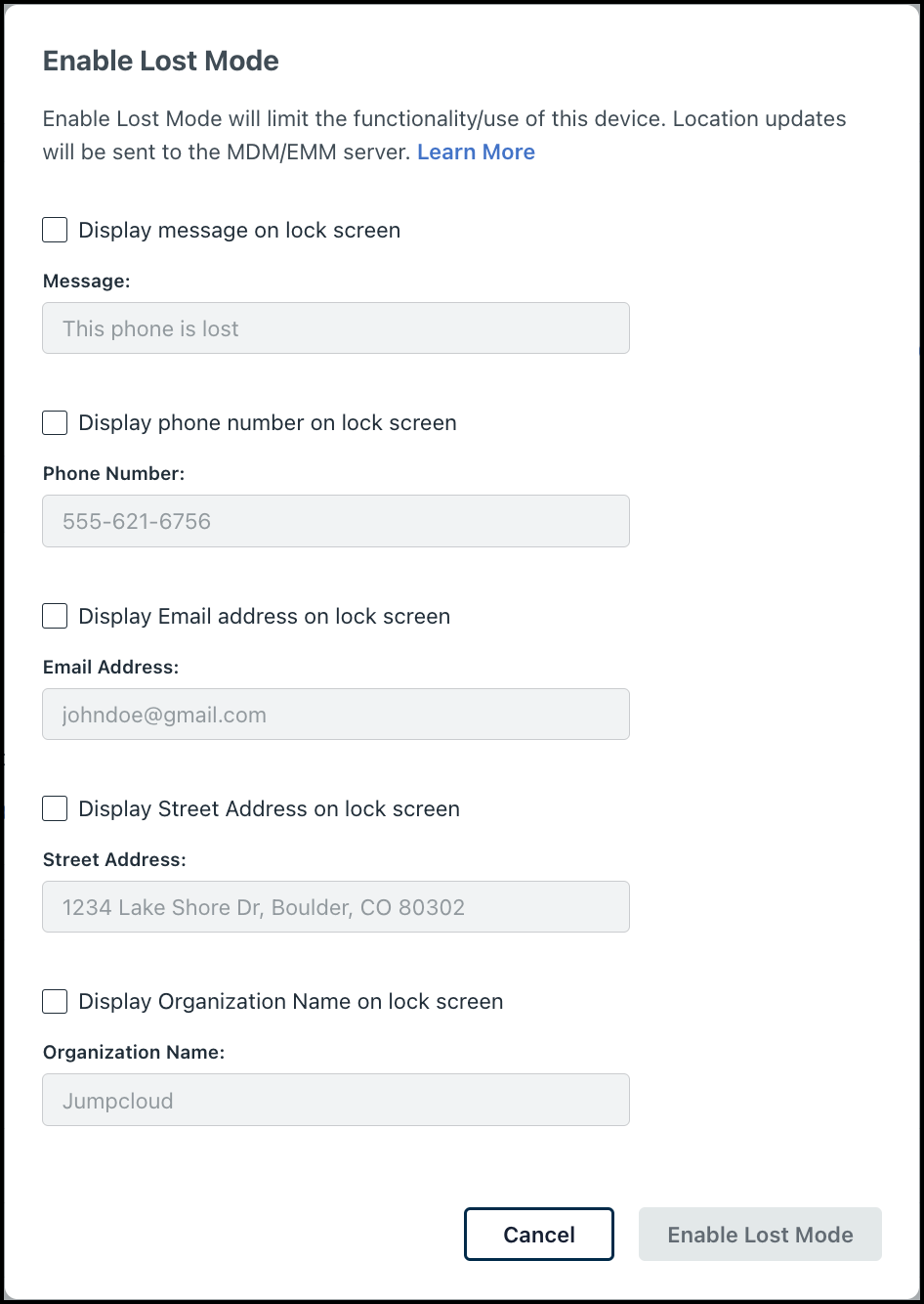 If a company-owned device is lost or misplaced, you can enable Lost Mode from within the JumpCloud Admin Portal. When enabling Lost Mode from the Admin Portal, you can supply contact information that will appear on the device’s screen to prompt the holder of the device to return it to you. If the device is returned, you can then turn off Lost Mode and restore the device to full functionality.