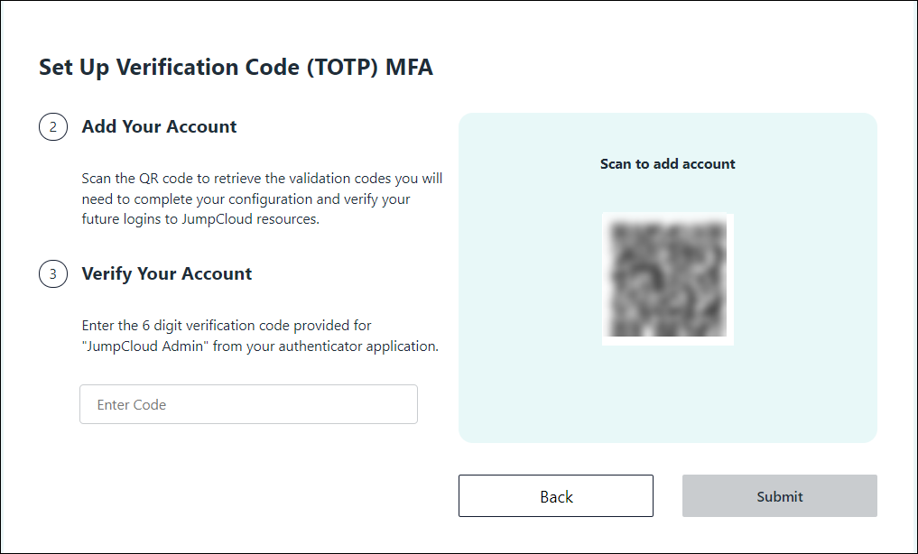 If you haven't enrolled in MFA and your organization requires it, or if you’re locked out of your JumpCloud Administrator account after enabling MFA, you can enroll or reset from the Admin Portal login flow. You may also ask the designated admin for your company to reset it for you.