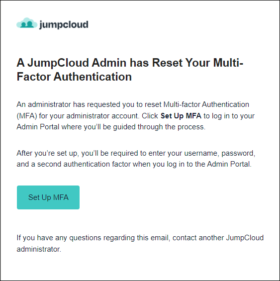 - Instruct the administrator to check their email inbox and click Set Up MFA in the email message. This link is valid for 24 hours.