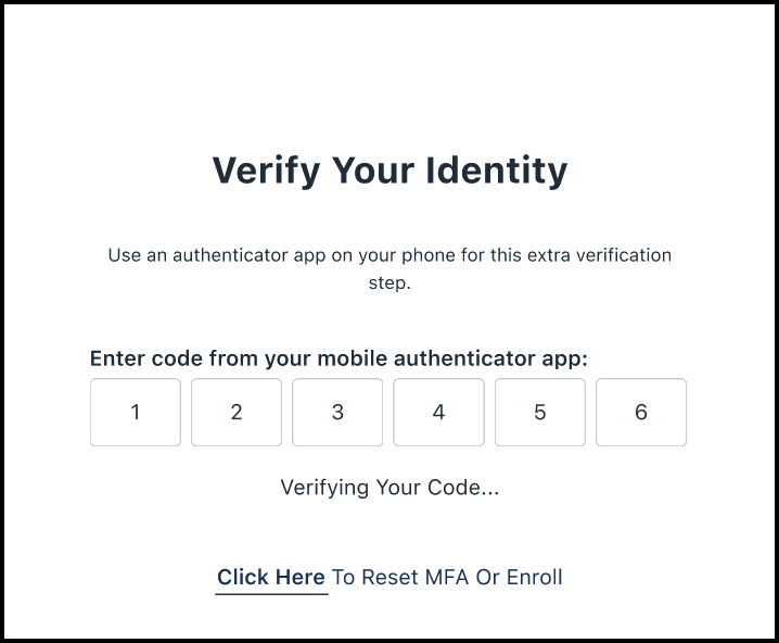 - When prompted for MFA, click the link at the bottom of the Verify Your Identity page to reset or enroll.