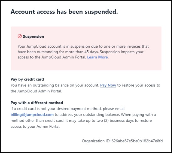 The following modal will appear in the Admin Portal when there are one or more invoices on your account that have been outstanding for at least 45 days. When the account is suspended, you won’t be able to navigate or make changes in the Admin Portal. Access to your account will be restored once payment is received.