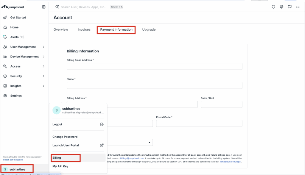 JumpCloud Admins can only access billing information if they are assigned an Administrator With Billing role. With the role, they can change the payment method. See Manage Admin Accounts.