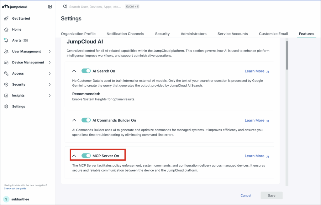 JumpCloud’s Model Context Protocol (MCP) Server lets you connect compatible AI tools to JumpCloud and interact with your organization’s data and administrative capabilities. With MCP, you can view, edit, and modify many aspects of your JumpCloud org directly within your existing AI tools like code editors, large language models (LLMs), and AI agents.