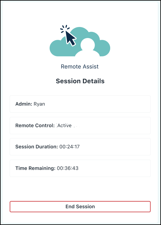 - After the session is established, the Admin has control over the end user’s device until the session duration times out, control is revoked by the end user, or the session is terminated by either the Admin or end user.