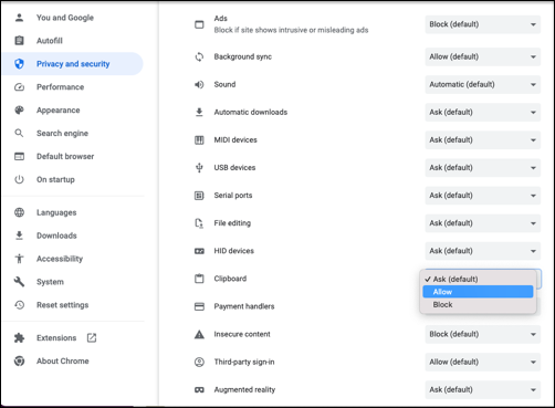 - Under Privacy and Security, click the Clipboard menu option.