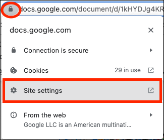 - In the Google Chrome browser address bar, click the lock icon and then click Site Settings.