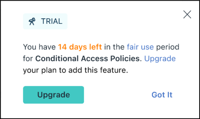 A reminder appears upon login when you have been trying a trial feature for 15 days or longer. This reminder is specific to the device, which means that each IT admin in the org will see the reminder if they are using unique devices to access the Admin Portal. Unlike the trial badge and trial banners, you can dismiss this notification.