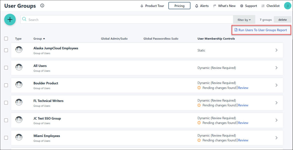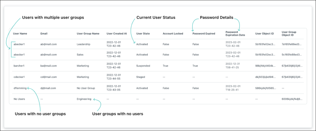 The Users to User Groups Report shows which users belong to each user group. If a user is a member of multiple user groups, that user will have multiple records in the report. For users who don’t belong to any user groups, there will be a record reflecting “no user group”. Likewise for user groups with no members, there will be a record reflecting “no users”.