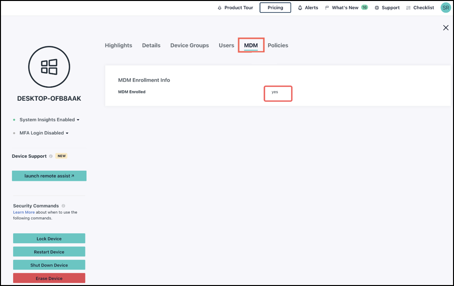 - To view a device's enrollment status, select the device from the devices list, and click the MDM tab.