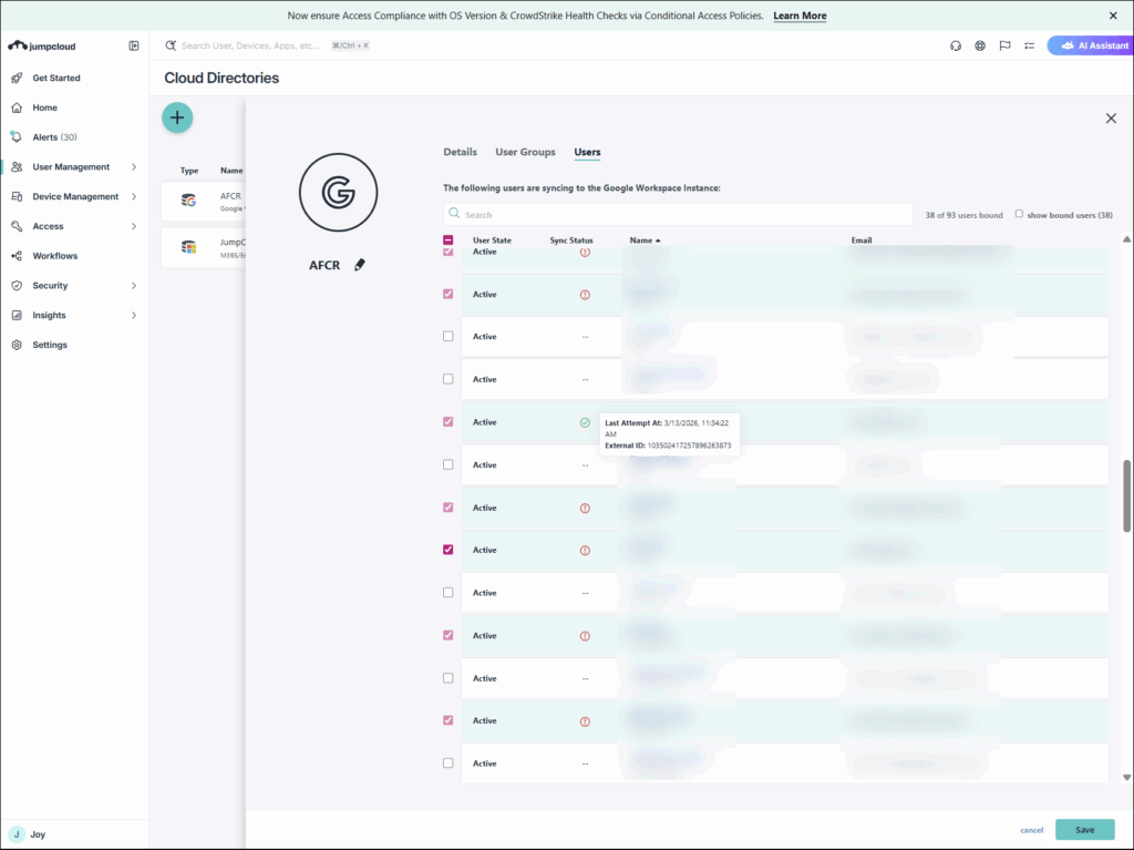 - Continuously sync changes from Google Workspace to JumpCloud when user identities are being managed in Google